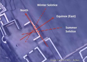 That this direction once pointed north seems consistent with the alignment of the Temple of the Three Windows (Figure 2). The orientation of the eastern wall, -34° (or 34° west of north) is aligned to within a few degrees of the Bering Sea pole. This means that if the North Pole were in the Bering Sea, the three windows would have faced due east and the Sun would have risen in line with the temple on the equinox (Figure 3).