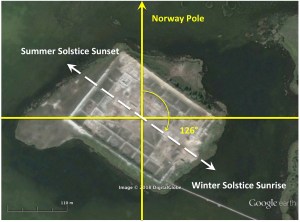 The Norway pole is −28.2° or 28.2° west of the current North Pole. The site would have been aligned at an azimuth angle of 28.2° + 97.5° = 125.7°, which is within 0.3° of the winter sunrise/summer sunset solstice angle of 126° at the latitude of the site when the pole was in the Norway Sea and Earth was at maximum obliquity (Figure 4).