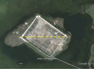 Notice that the diagonal of the site is aligned due east-west. This means that the solstice angle relative to east, 126° −90° = 36°, is also encoded in the aspect ratio of the site’s bounding rectangle; i.e., W/L = tan 36°.