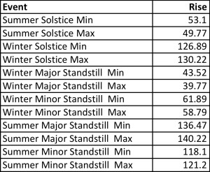 Does the azimuth angle of the site, 97.5°, coincide with solar or lunar events such as solstices or lunar standstills? Table 1 lists sunrise azimuths at the summer and winter solstices and moonrise azimuths at the major and minor lunar standstills at Earth’s minimum and maximum obliquity angles. Clearly, the site is not rotated enough to the east to line up to any of these events.