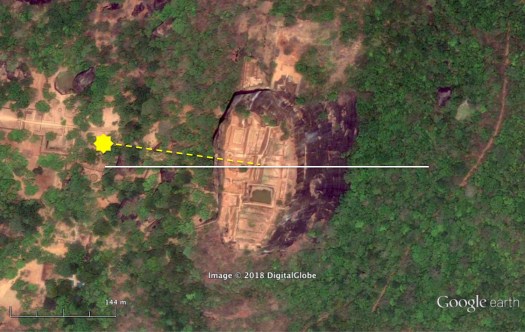 The rock fortress and surrounding complex are rotated approximately 8.5 degrees east of north. Amelia Carolina Sparavigna has determined that the site is aligned to the sunset on the days when the sun at mid-day is directly overhead. At the equator, the sun passes directly overhead on the equinox. The sun can also pass overhead at places near the equator on days surrounding the equinox. For example at Sigiriya, latitude 7.95° N 80.75° E, this happens around September 1 and April 11, which is about twenty days after the spring equinox and twenty days before the fall equinox (Figure 1).