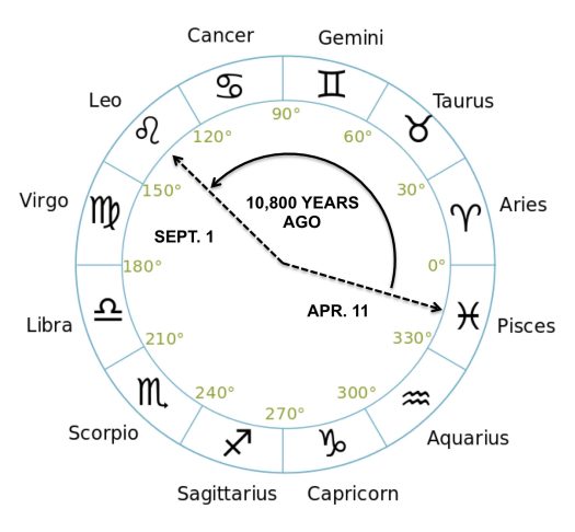When was the last time the sun rose and set in the constellation Leo? There are two answers based on Sigiriya’s alignment. In the fall, on or around September 1, the last time the sun rose in Leo was one full precessional cycle ago, 26,000 years, or about 24,000 BCE. (Given the cyclic nature of the precessional cycle, its age could conceivably be N x 26,000 years, where N is an integer.) In the spring, on or around April 11, the last time the sun rose in Leo was about 5 astrological signs ago, 5 x 2160 = 10,800 (or 10,800 + N x 26,000) years ago as determined from the diagram below.