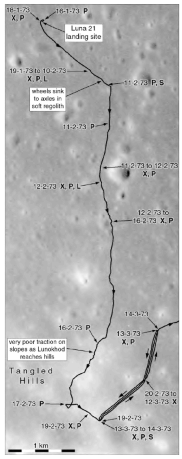 This is when, according to both the Tass and Soviet Aerospace stories, the rover was analyzing and taking photos of the monolith. The location of the rover over this period of time is marked in the figure with the label “12-2-73 to 16-2-73 X, P” where “X” and “P” indicate that x-ray fluorescence spectrometer measurements and panoramic photographs were taken, presumably after the rover had left the shade of the boulder and traveled south.