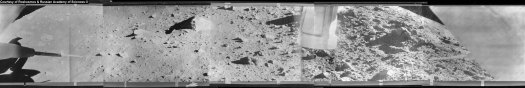 Most of the panoramas show rolling, relatively featureless terrain. Figure 2 shows one of the photos taken during the second month (lunation) of lunar operations. Notice the angular rock in the center of the photo. The length of its shadow indicates the picture was taken late in the day, not around noon, when the rover was said to have been parked next to the large boulder. Other than Figure 2, none of the photos shows anything resembling a slab, let alone a monolith.