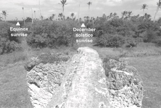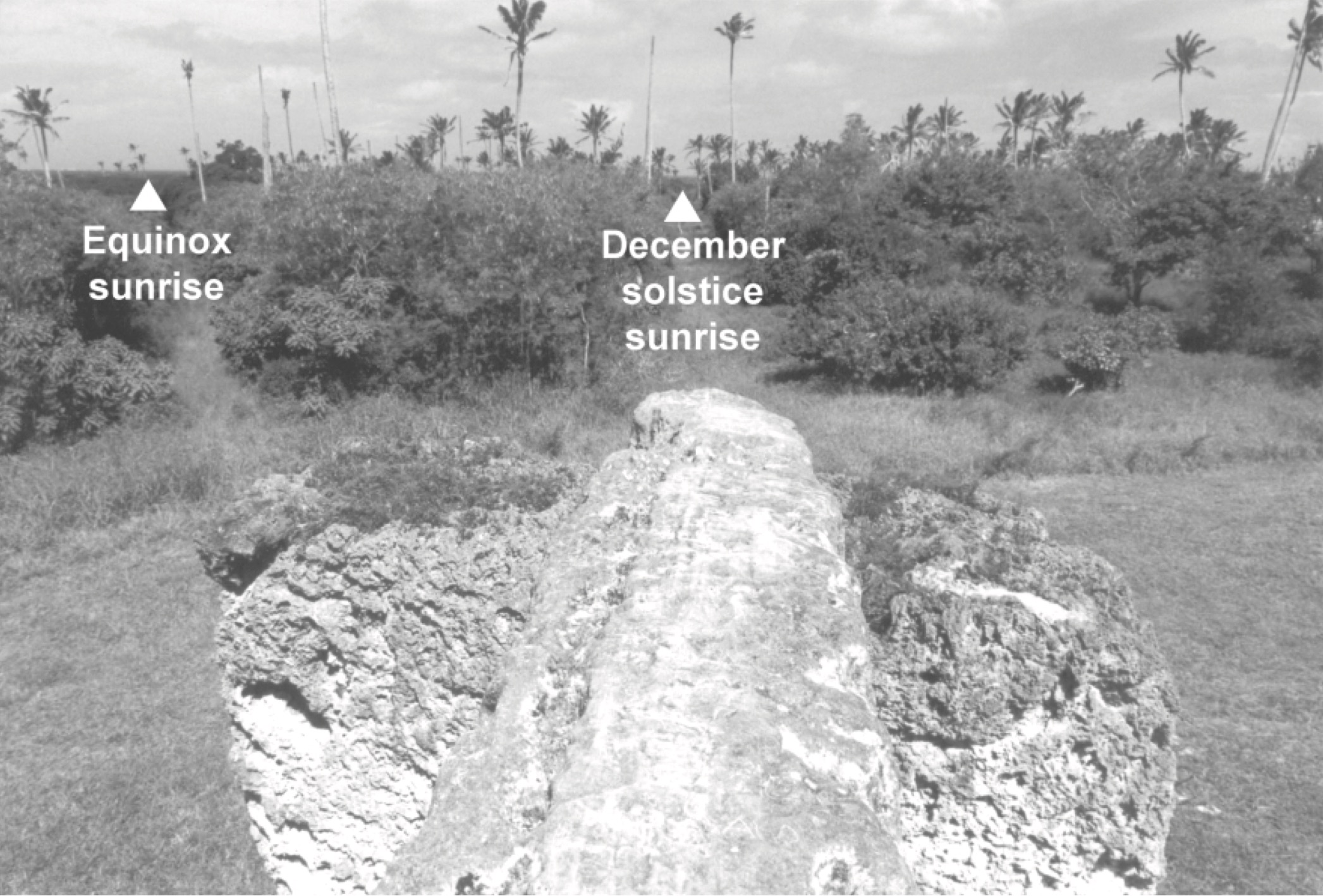 Although it is widely thought to have been aligned to the summer solstice sunrise/winter solstice sunset, an interesting photo taken along the lintel by Esteban reveals that it is misaligned by several degrees. It turns out to be very closely aligned perpendicular in the direction of the Hudson Bay pole and so would have been once oriented east-west. It is interesting to note that this direction is similar to that of land-use patterns in many parts of the island. Aveni (1980) notes that in Mexico alignments of churches built over earlier structures and planted fields often follow patterns that had been established in pre-Columbian times. Perhaps this pattern on the Tongan landscape was first established tens of thousands of years ago when the North Pole was in Hudson Bay.
