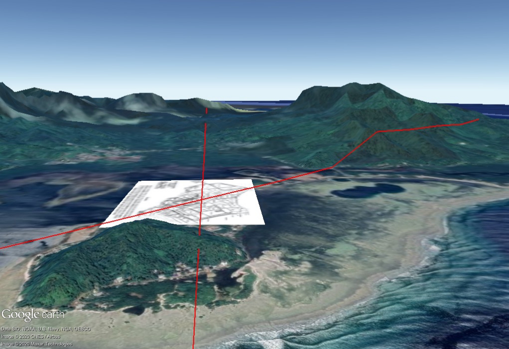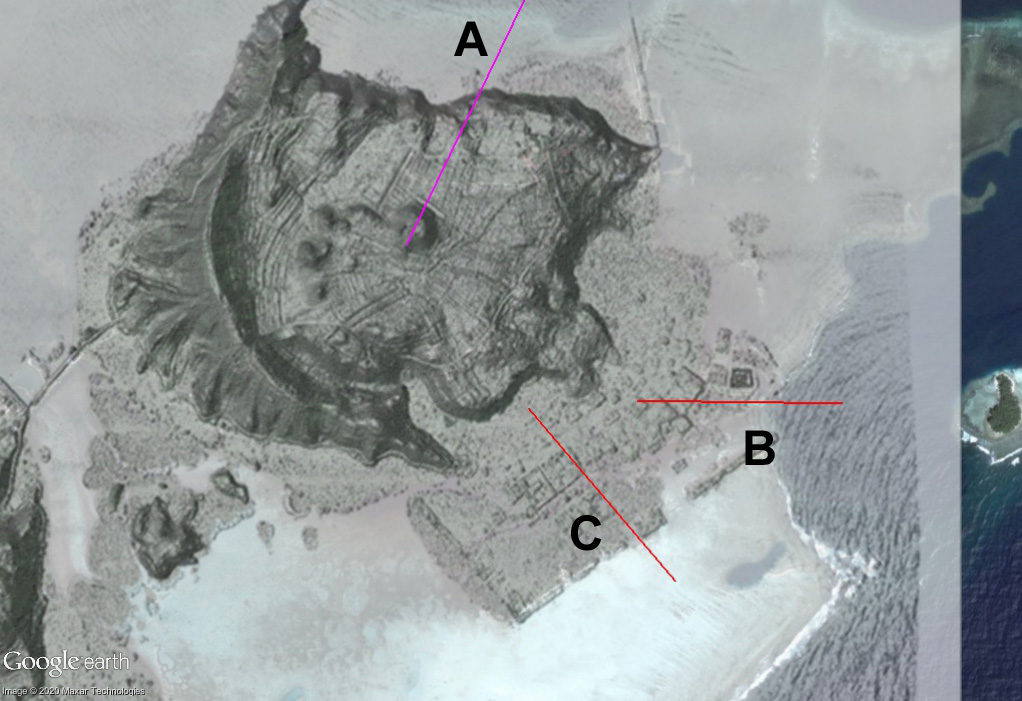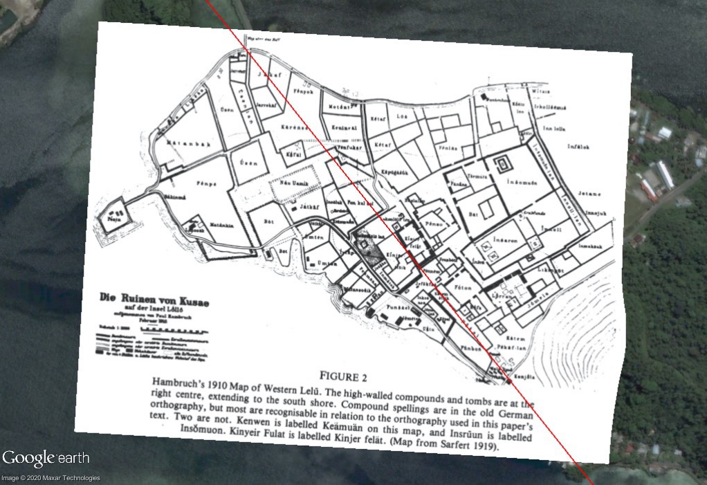 Even more intriguing than the materials used in construction is the similarity in the alignments at Leluh and Nan Madol. Esteban (2002) reports the orientations of the northeastern sides of five tombs range in azimuth from 47° to 59°. Their southeastern facing sides are thus aligned in the range 137° to 149°. Being at a similar latitude the solstice sunrise directions are similar to those at Nan Madol relative to the Hudson Bay pole. By registering Hambruch’s original 1910 map to create an image overlay in Google Earth we are able to verify that the ancient city itself is aligned in the same general direction of the solstices.