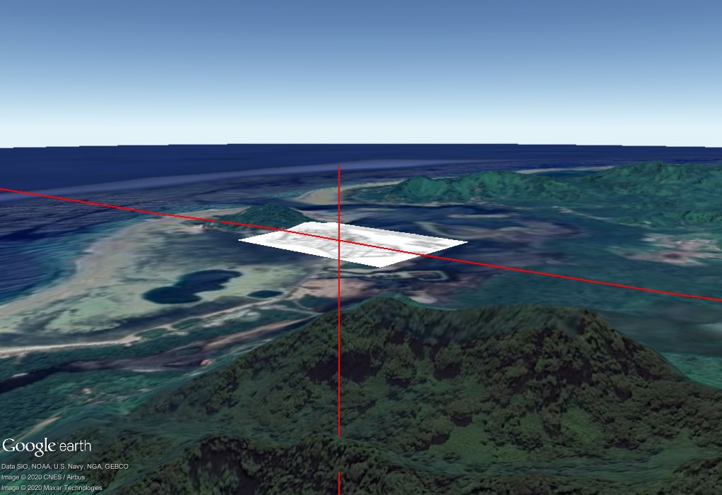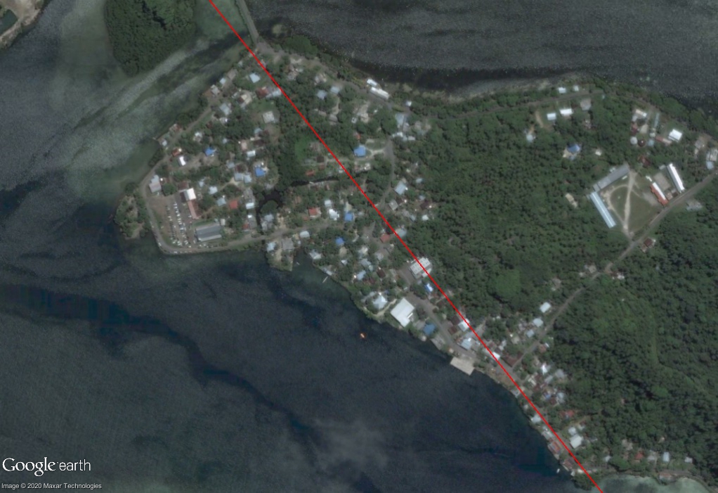 The range of sunrise directions assuming the North Pole was in Hudson Bay may also explain why Leluh was originally built off of the east coast of Kosrae. Extending sightlines in the solstice directions reveal that the southern sunrise and sunset directions relative to the Hudson Bay pole bracket the mountainous landscape of Kosrae to the southwest. On the summer solstice, the sun would have risen to the southeast over the ocean and set west between two mountains on Kosrae.