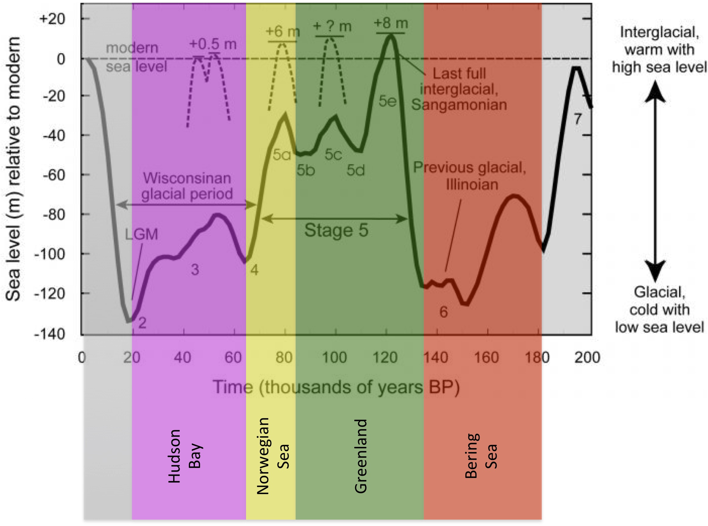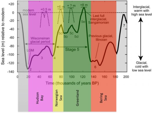 Generally speaking, during glacial periods when there is more ice at the poles, sea levels are lower than during interglacial periods when there is less ice. The amount of ice depends on temperate, which in turn depends on how much solar radiation is absorbed at the surface or reflected by clouds and ice. Hapgood hypothesized pole shifts were caused by a build-up of ice in the polar regions that eventually create an imbalance large enough to cause the crust to slip over the mantle and shift the added mass toward the equator. When the mass of ice at the pole shifts to a lower latitude some of it melts leading to a rise in sea level. Then as ice begins to accumulate at the new pole, sea levels slowly decrease, and the cycle repeats. Using this basic pattern we can estimate the timing of pole shifts from sea-level changes.