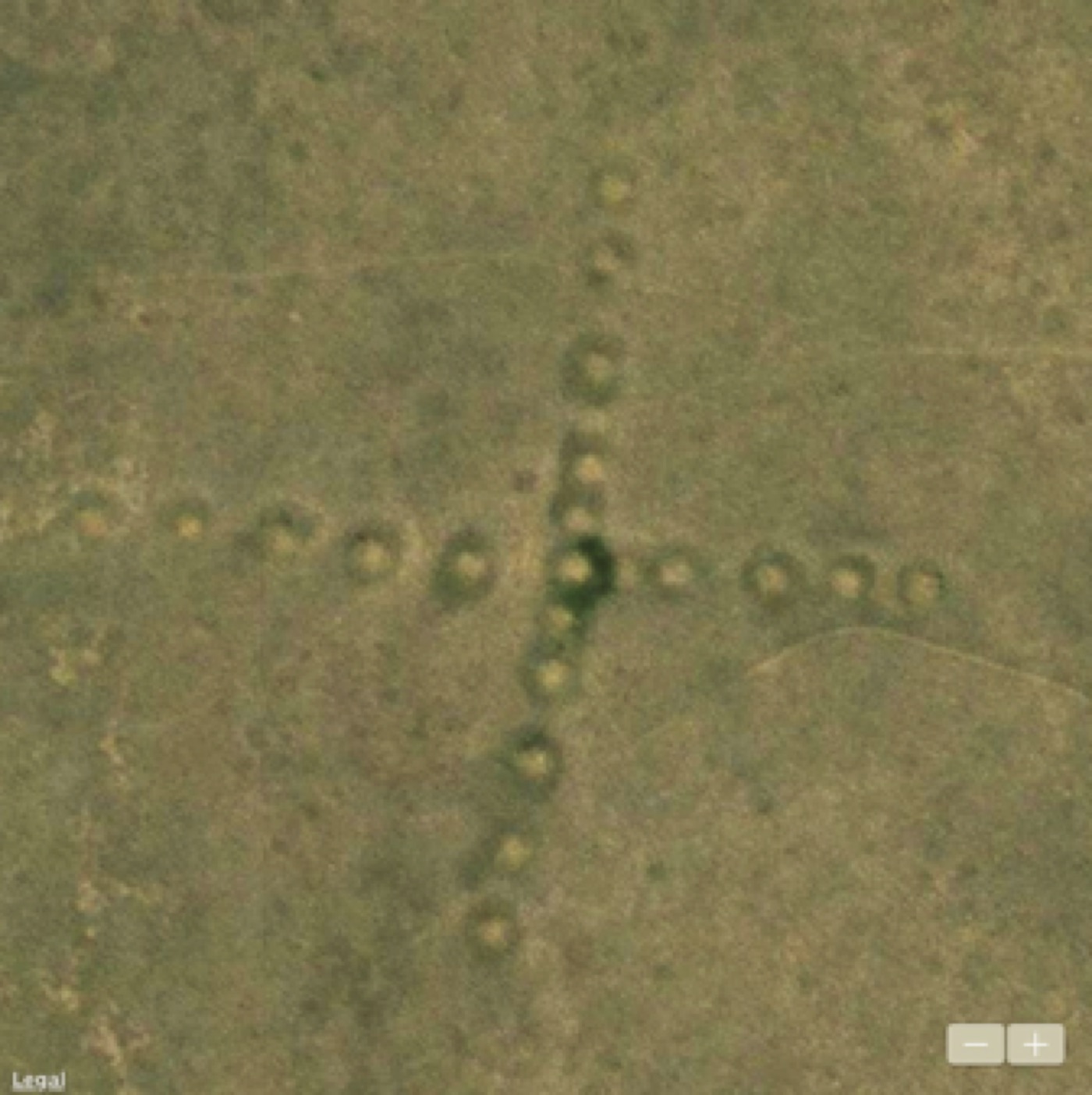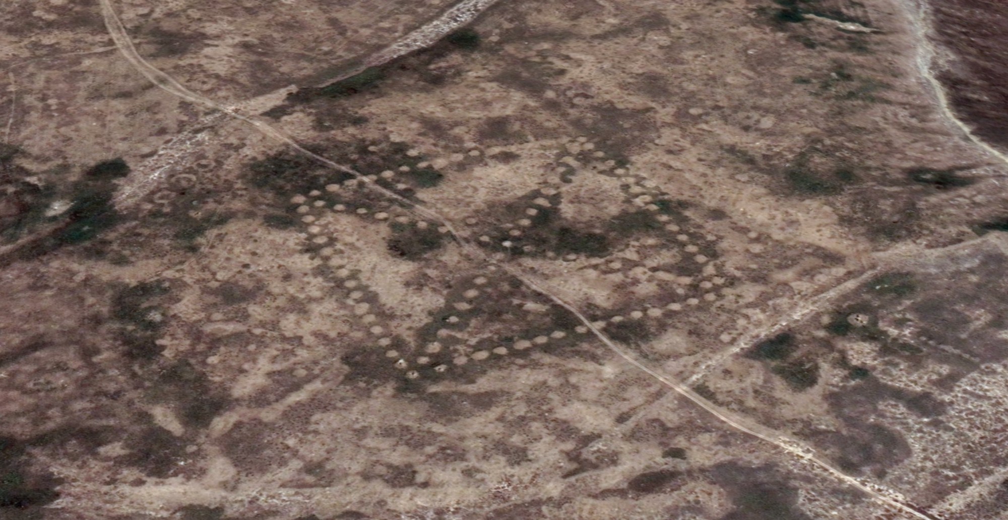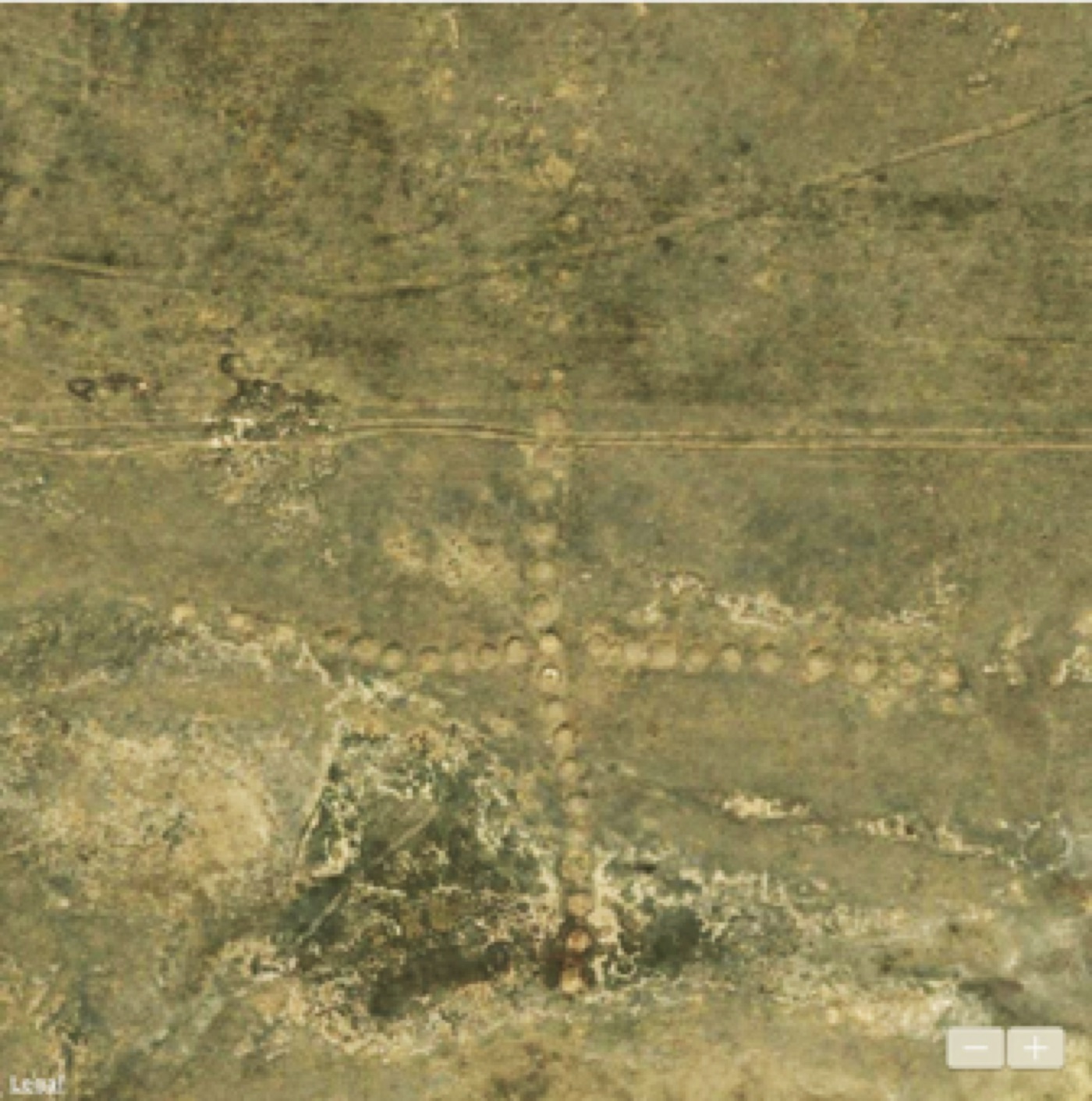 In 2007, Dimitriy Dey discovered a large number of “geometric earthworks” in the steppes of northern Kazakhstan including linear arrangements of earthen mounds, cross figures, squares, and other shapes. These features are found at points of high relief, such as on plateaus and river divides. Like the Blythe Intaglios in California along the Colorado River and other geoglyphs discussed in previous articles, those in Kazakhstan can only be seen from above.