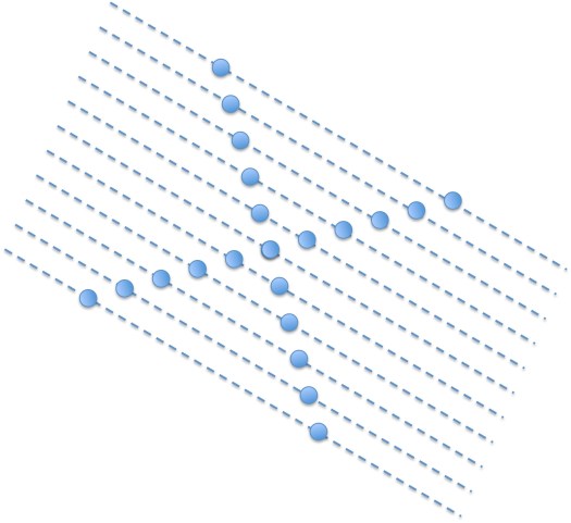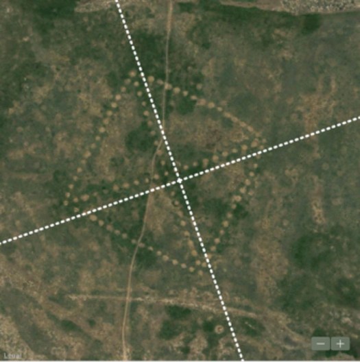 In an attempt to understand their orientation an interesting alignment has been discovered. Instead of using the arms to define the direction of a cross, consider the series of lines that pass through successive pairs of mounds equally spaced from the center.