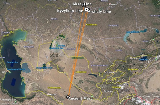 In a study of the alignment of ancient sites in Greece, it was determined that either the ancient Greeks or their ancestors aligned certain temples to face older oracle sites as far as 700 miles away (Carlotto 2019). Here we have found that the Kyzylkan Line and the nearby town of Tasty, the Arshaly Line, and possibly the Aksai Line appear to point to the direction of the ancient city of Merv over 900 miles to the south-southwest.
