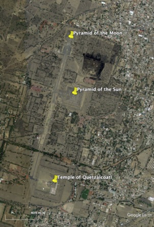 In another proposed Orion correlation, also illustrated above, an even greater skew is introduced if we try to match these same three stars to the layout of the Temple of Quetzalcoatl and the pyramids of the Sun and Moon at Teotihuacan.