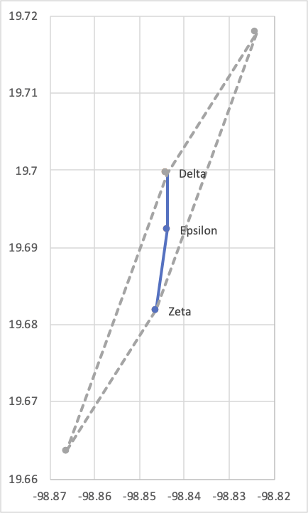 Ideally, a mapping of stars to the ground should be “conformal” — preserving shapes and angles. Attempting to match the three stars in “Orion’s Belt” to the corresponding pyramids in Giza stretches and distorts the pattern of the stars so that they match the corresponding pyramids (see figure below). However, forcing a match in this way skews the pattern. Mappings with a large amount of skew are not conformal and not accurate representations of the star patterns on the ground. The amount of skew can be measured by mapping a rectangular region in the sky to the ground. If the projected region is rectangular (corner angles close to 90°), the transform has minimal skew.