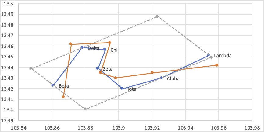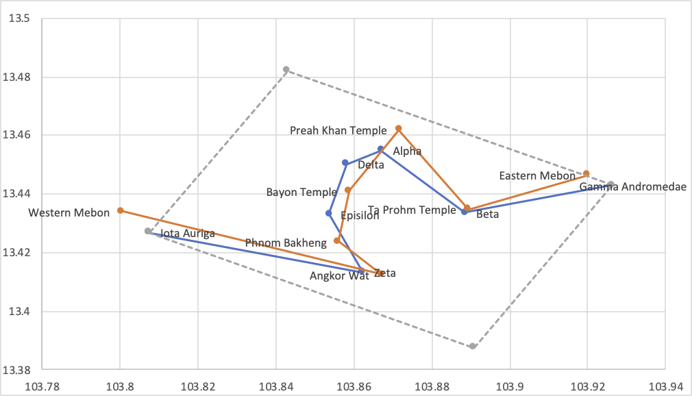 In Heaven’s Mirror, Graham Hancock and John Grigsby claimed the layout of temples at Angkor were correlated with the pattern of stars in the constellation Draco. Although they identified more than three temples/stars, there was a methodological problem. According to Jason Colavito, “It looked like many of the stars of Draco were missing, and Angkor seemed to have temples where there were no stars.” In order to fill in some of the missing information, using Google Earth, seven temples can be identified that appear to be correlated with stars in Draco. Using our method to match this pattern of temples to the corresponding stars in Draco results in a mapping with much less skew. As mentioned above, a simple measure of skew is the amount the corner angles of the rectangles deviate from 90°. The corner angles for the Draco-Angkor correlation are 90±6°. This is much less than Orion-Giza (corner angles 90±18°) and Orion-Teotihuacan (corner angles 90±75°).