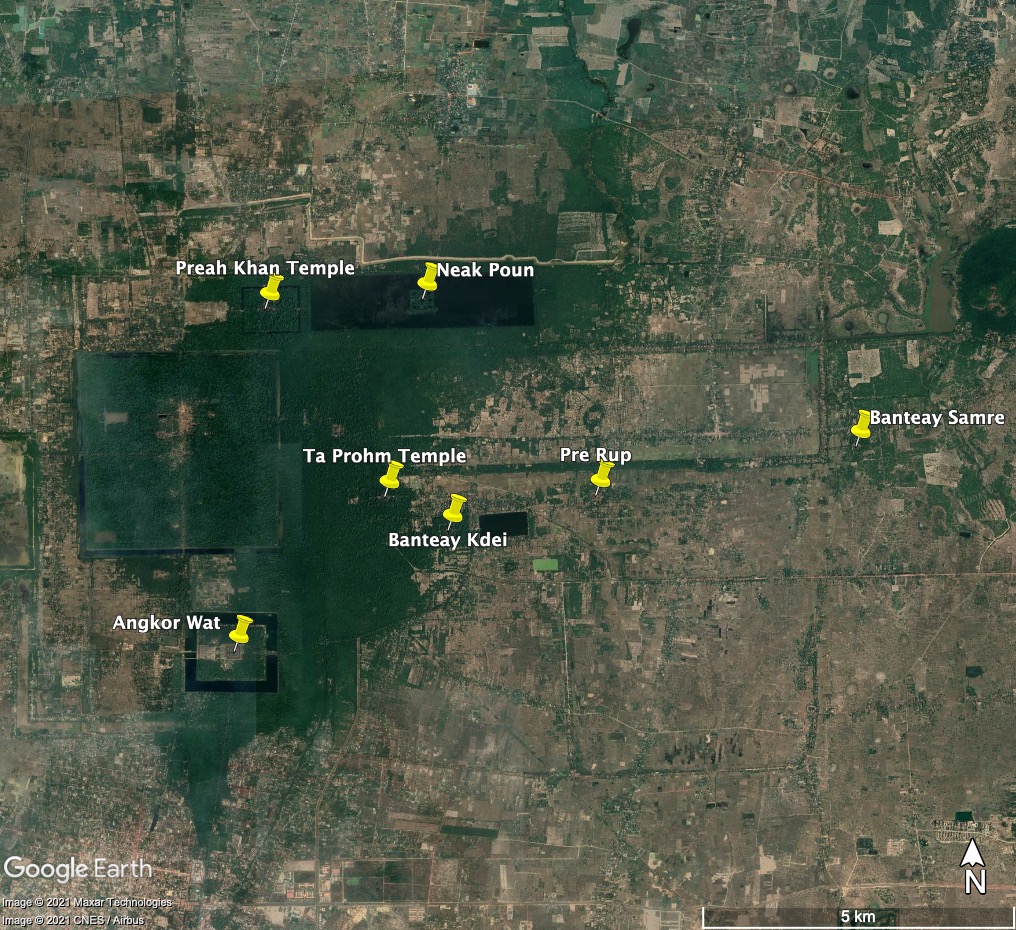Perhaps the key question in evaluating a correlation hypothesis is whether or not the terrestrial pattern can be seen by an observer as a “reflection” of the corresponding stars. Viewed from the north, Orion would have reached its culmination along the meridian over the Giza pyramids circa 2450 BCE. Although there are mountains south and east of Teotihuacan, they are too far away for an observer to see the individual structures at the site, and looking north-northwest, Orion would not be in the field of view at any time. The terrain at Angkor is relatively flat. It would therefore be difficult to visualize the layout of Angkor Wat and the surrounding temples over an extended area. If the Angkor temples were arranged to match the Draco, how did they do it, and for what purpose was it done?