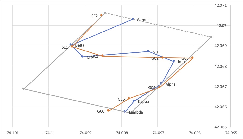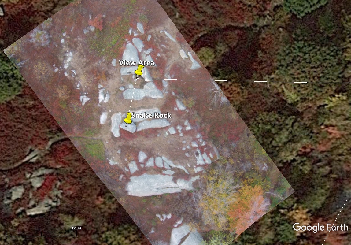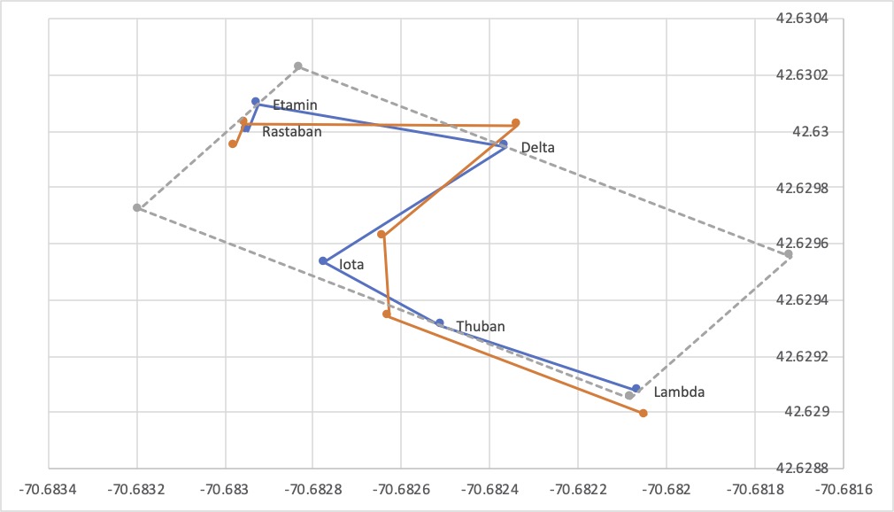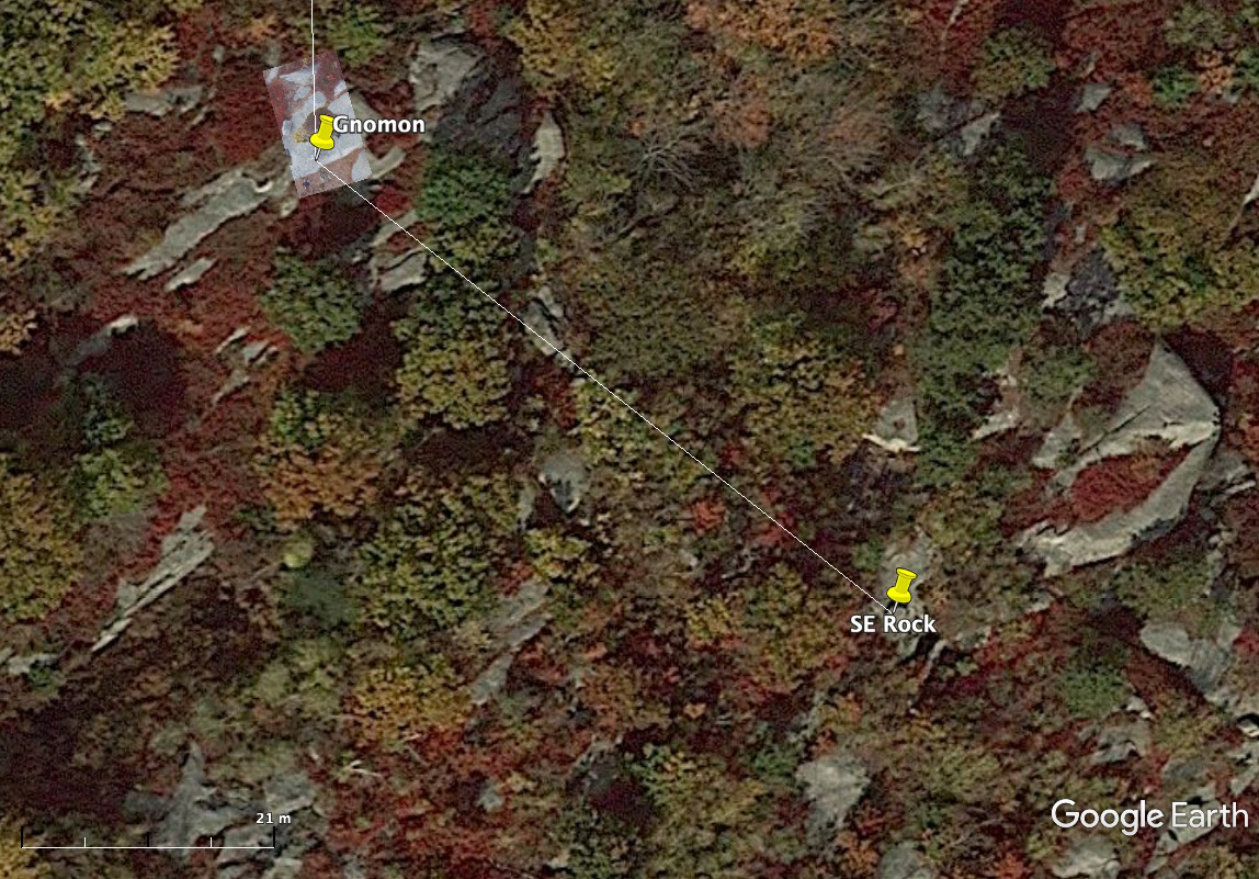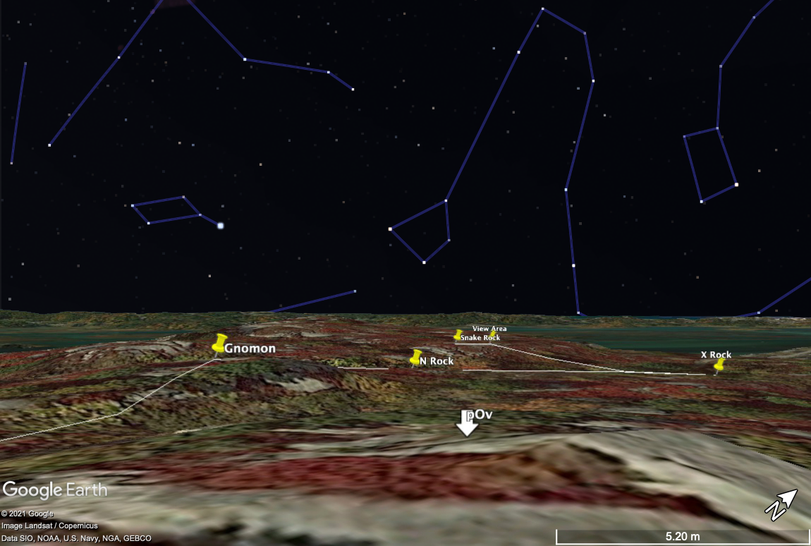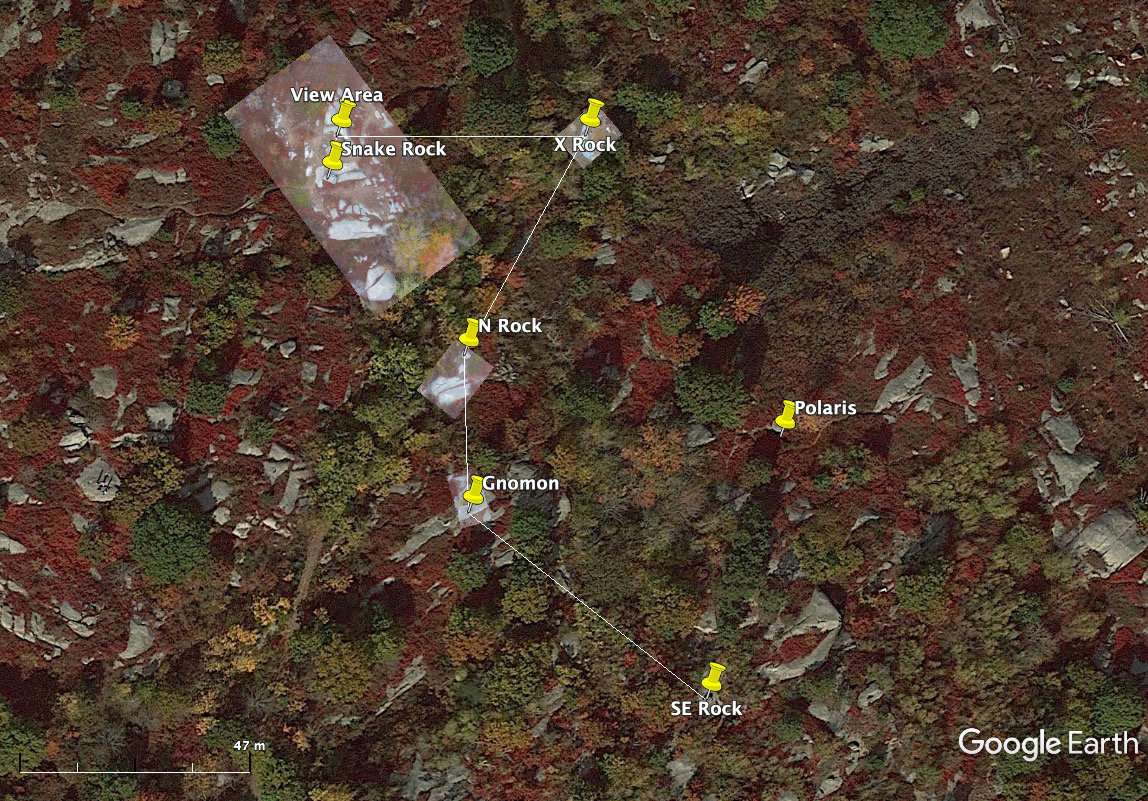 The skew is the least of all sites considered (corner angles 90±4°) with a relative error of 6.7%. As shown above, the stone features on Overlook Mountain can be seen as a “reflection” of the constellation Draco as it sets above the northwest horizon around the winter solstice when viewed from a vantage point to the southeast. If the stone features at the site can be dated, the degree to which the visual correlation could have been better/worse at that time can be assessed.