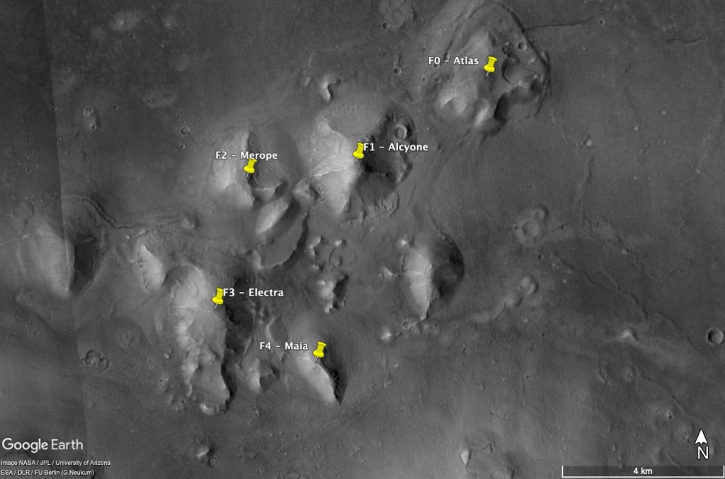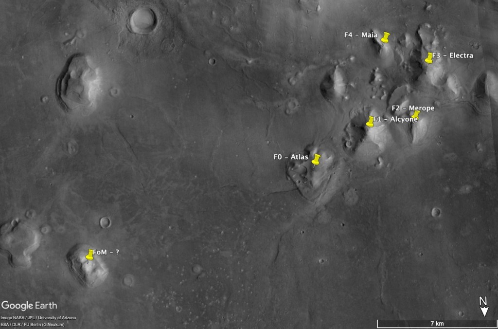 Perhaps Wayne Herschel’s most controversial star map is on Mars. Using a recently developed method tested at several terrestrial sites, we find a high degree of correlation between selected stars in the Pleiades and landforms in the City. As shown in the figure below, five ground features were selected based on their size and shape and corresponding stars identified. Remarkably, the patterns match better than most terrestrial sites tested in our previous study with a relative accuracy of 3.5% and a skew of 3.5°.