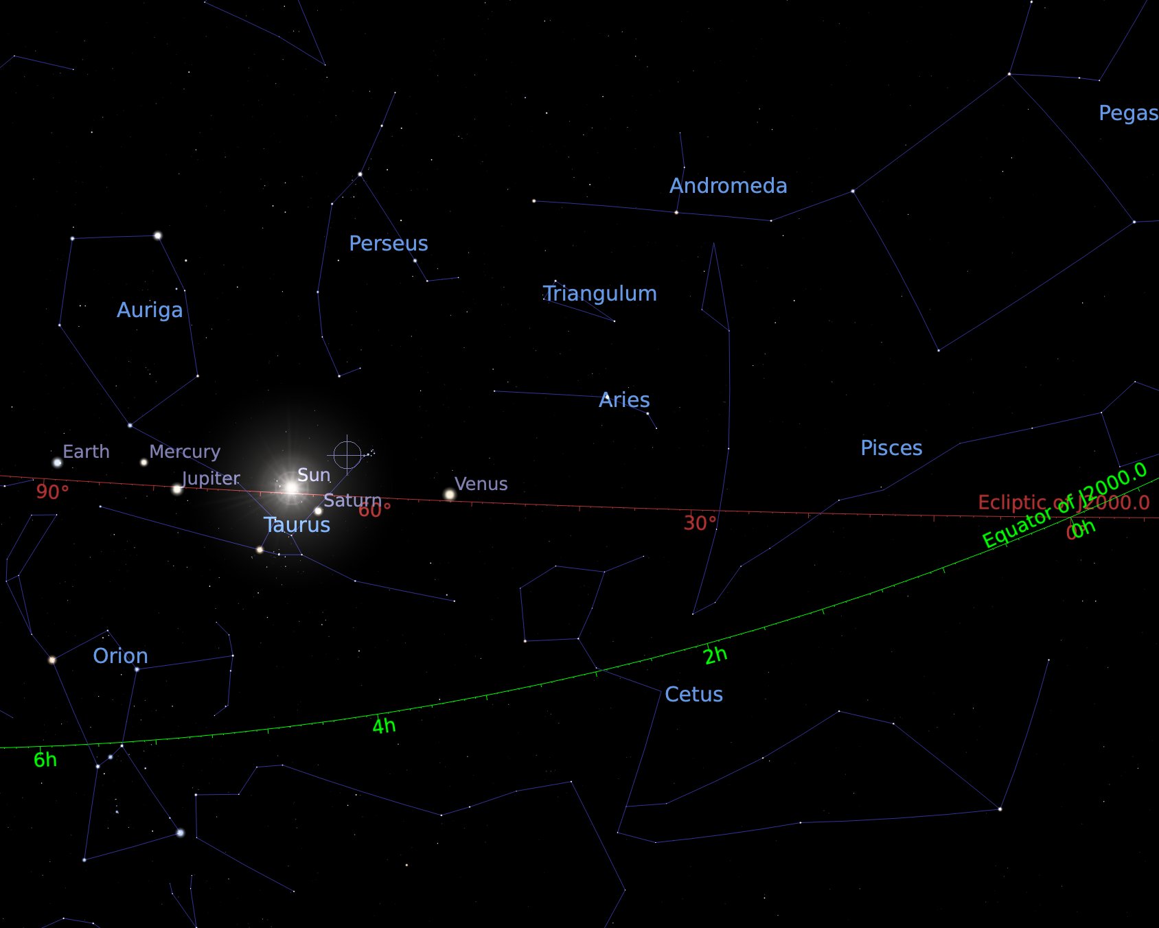 Current ecliptic as viewed from Mars (red). Estimated location of ecliptic 280,000 years (orange) passes through the crosshairs that mark the projected location of the Face in the sky. (Stellarium)