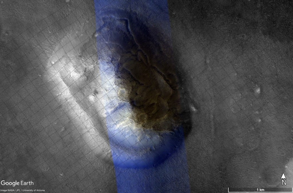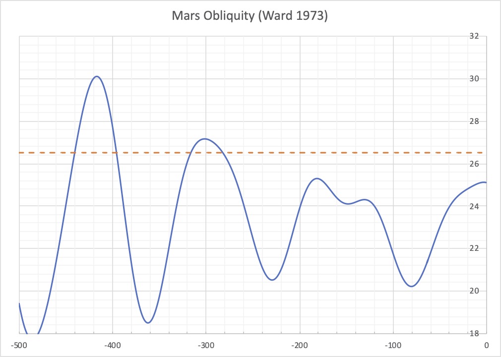 This location (denoted by the crosshairs in the above images) is about 1.4° away from the ecliptic. Mars is currently tilted 25.1° on its axis. Using a model of Mars’ obliquity, the last time the planet was tilted 26.5° was 280,000 years ago.