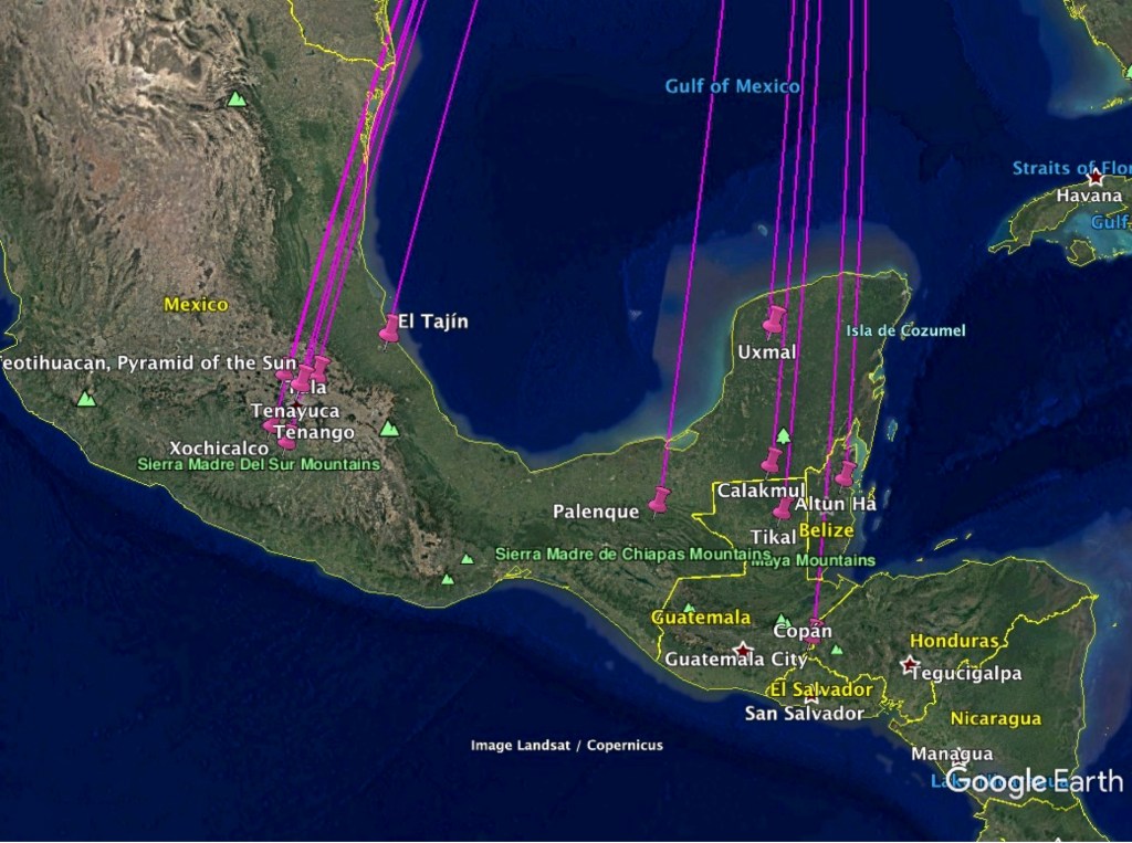 Numerous places in Mesoamerica contain structures aligned in a direction roughly 17 degrees east of north – places such as Teotihuacan, Tenayuca, Xochicalco, Ekbalam, Altun Ha, Copan, Tikal, Uxmal, and Mitla.