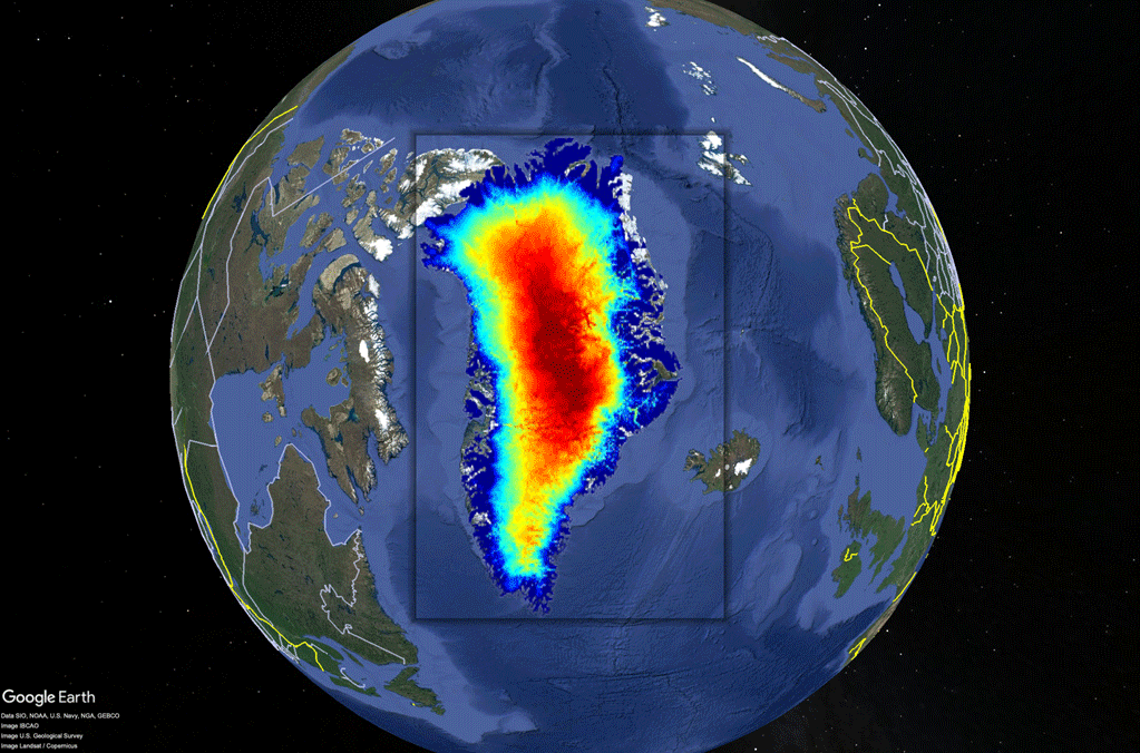 In the north polar region, the thickest ice is in the mountainous interior of Greenland, about 1200 miles from the North Pole. In Antarctica, the thickest ice is not at its center at the South Pole but almost 1000 miles away in the high plateau of Eastern Antarctica.