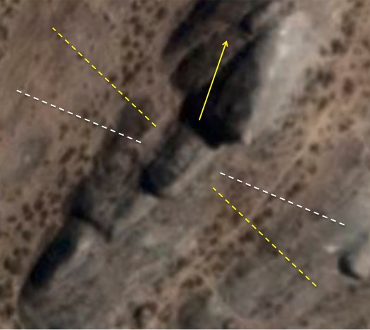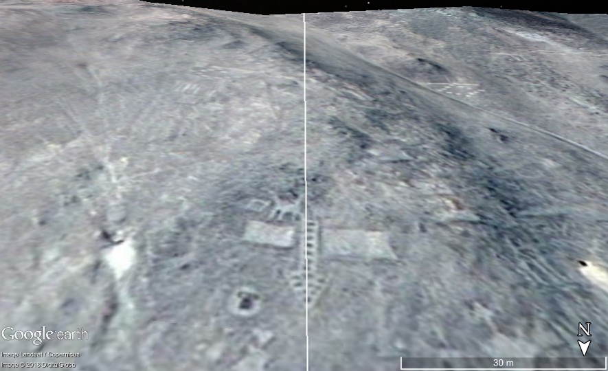 Three structures are visible in Google Earth imagery. C1 is a “megalithic acropolis” consisting of two stone platforms each about 30×30 meters in area whose “outer walls reach at least 7 to 8 meters high at the northwest corner and are entirely built of massive ashlars, some of which over 2.5 meters long. The construction is of remarkable quality and accuracy, consisting of several layers of carefully laid out and jointed megalithic stone blocks.” [2]