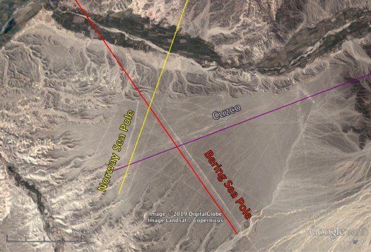 Places in South America such as Cuzco and sites in Peru’s Sacred Valley and in other parts of the world appear to be aligned to an even older pole located north of the Aleutian Islands in the Bering Sea. Up to this point, no site in Mesoamerica had been found to be aligned in the direction of the Bering Sea pole, implying that Mesoamerica was not settled until after the Bering Sea to Norway Sea pole shift, which is estimated to have occurred about 125,000 years ago.